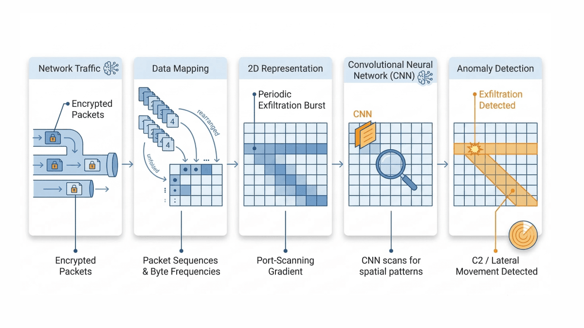 Defensive artificial intelligence addresses this problem by focusing on behavior instead of static code signatures. A signature is a static file hash or a sequence of bytes on disk, which only identifies threats that have been seen before. Behavior refers to what a file actually does when it executes in memory. Machine learning models learn the normal activity baseline for every device on the network, including patterns such as which processes typically run at startup, what files a user normally accesses, and what external connections a device regularly makes. If a new file executes and tries to modify registry keys or disable security policies, the behavioral analytics engine flags it as malicious regardless of what the code looks like. Deep learning is also applied in network detection systems, where packet sequences and byte frequencies are mapped into two-dimensional arrays, allowing convolutional neural networks to spot spatial patterns in the data. These models can detect anomalies such as periodic exfiltration bursts or port-scanning gradients that signal command-and-control communication or lateral movement, even when the payload itself is encrypted.