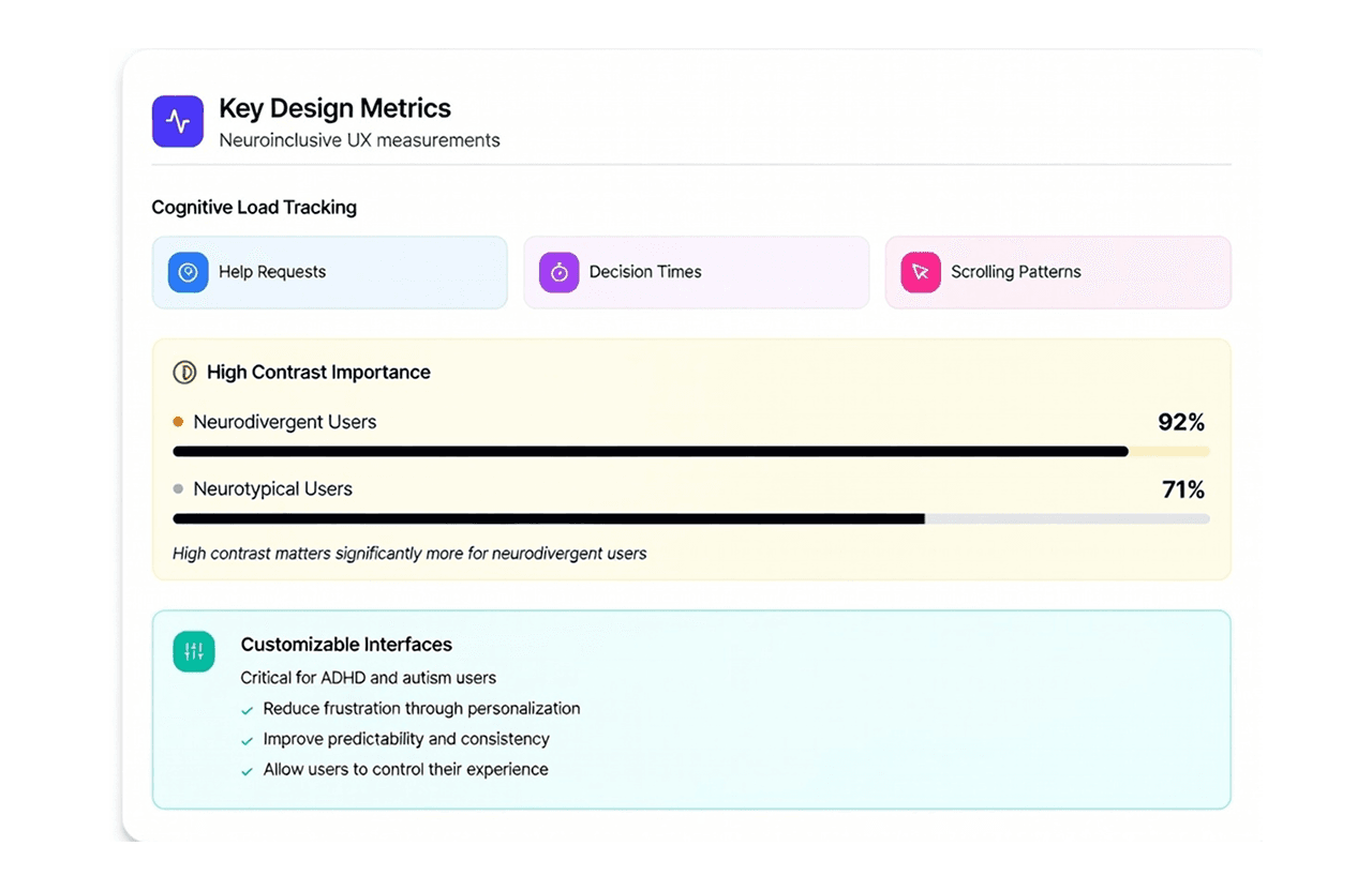 For users with memory impairments which make up approximately 18% of disabilities in some demographics or those experiencing high cognitive load, working memory is a scarce resource [4]. Uncertainty blocks decisions. If a user clicks a button and nothing happens immediately, anxiety sets in: Did it work? Did I make a mistake? Neuroinclusive UX also looks at signs like how often users ask for help, how long they take to decide, and how they scroll. Research shows that high contrast is important for 92% of neurodivergent users, compared to 71% of neurotypical users [5]. Customizable interfaces also reduce frustration and make interactions more predictable for people with ADHD and autism, helping them feel more in control.