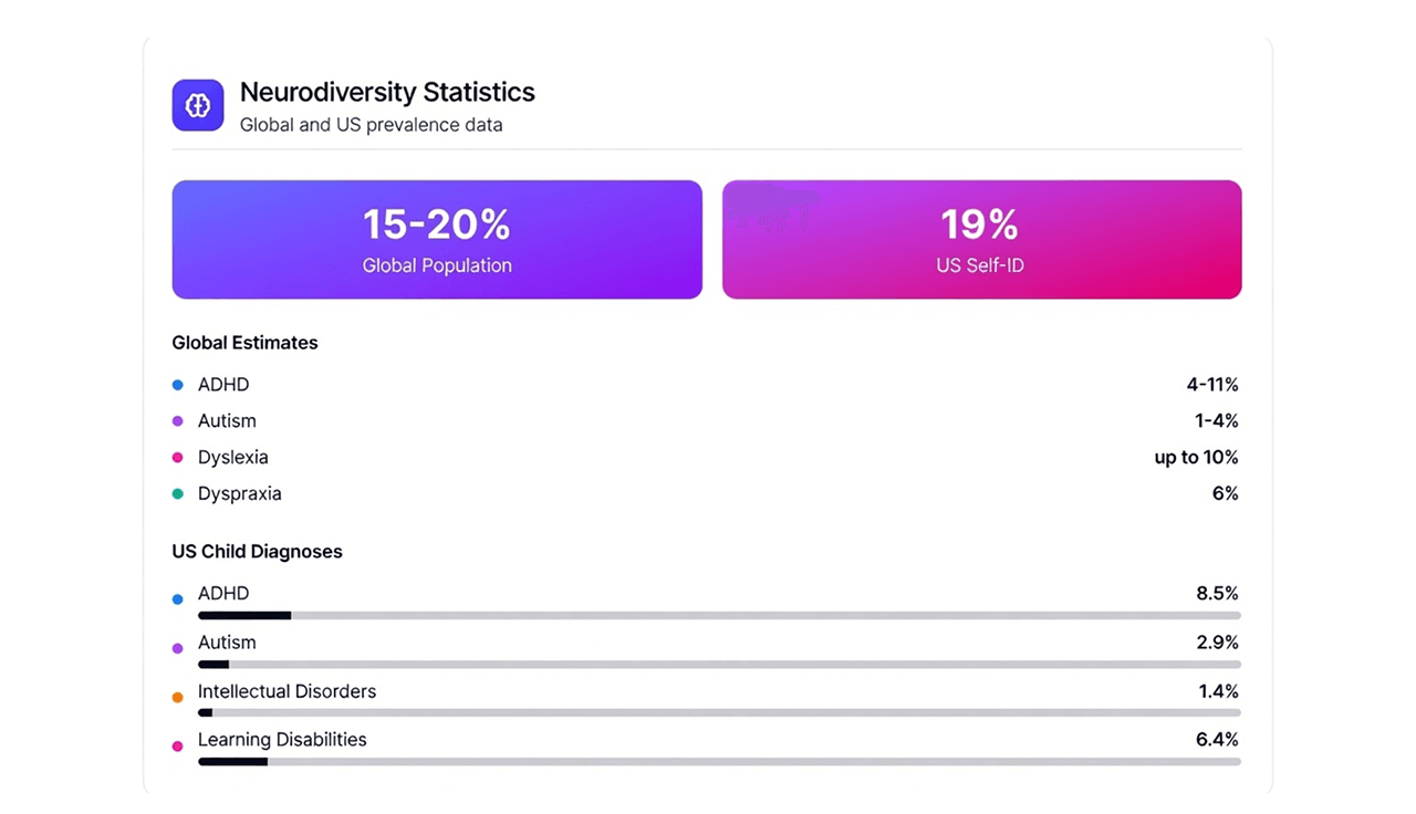 A significant portion of the population lives with cognitive or neurodevelopmental disabilities, such as ADHD, autism, dyslexia, and memory impairments. Globally, about 15 to 20 percent of people are neurodivergent, and nearly 1 in 5 adults in the US identify this way [1]. In Canada alone, it is estimated that 27% of the population has a disability, with a vast number of these related to learning, memory, or mental health. For these users, the barrier to entry isn't necessarily seeing the screen; it is processing the information upon it . This shows that cognitive accessibility is not rare and should be a basic part of digital design.